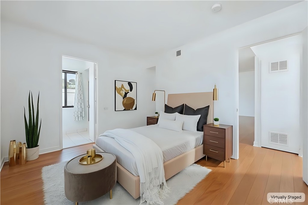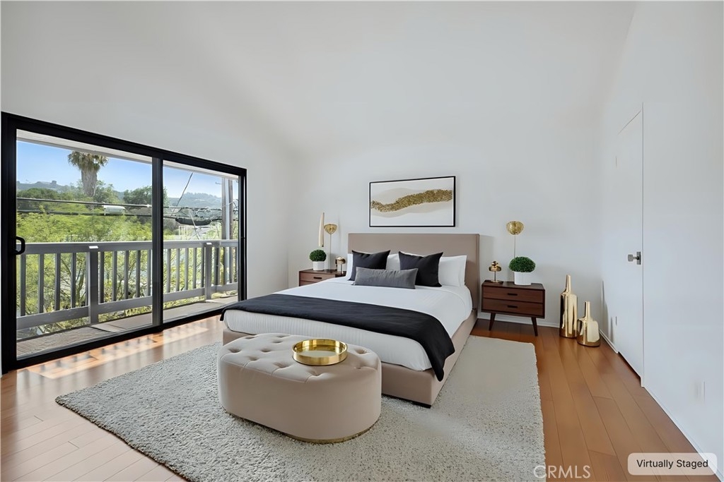 Amazing townhome located in the perfect spot - one block from Ventura Blvd in the heart of highly desirable Studio City. High ceilings with lots of light, hardwood floors, fireplace, stainless steel appliances, and laundry in unit. Corner unit in quiet back location of a small 8-unit building with only one common wall and double pained windows. Main bedroom is large and has a private balcony, walk-in closet, and vaulted ceilings. Spacious 2nd en-suite bedroom. The building features a beautiful swimming pool and a gated/secure garage with dedicated 2 parking spaces. This is beautiful oasis with all the best shopping, dining, entertainment and highly desirable schools right around the corner.