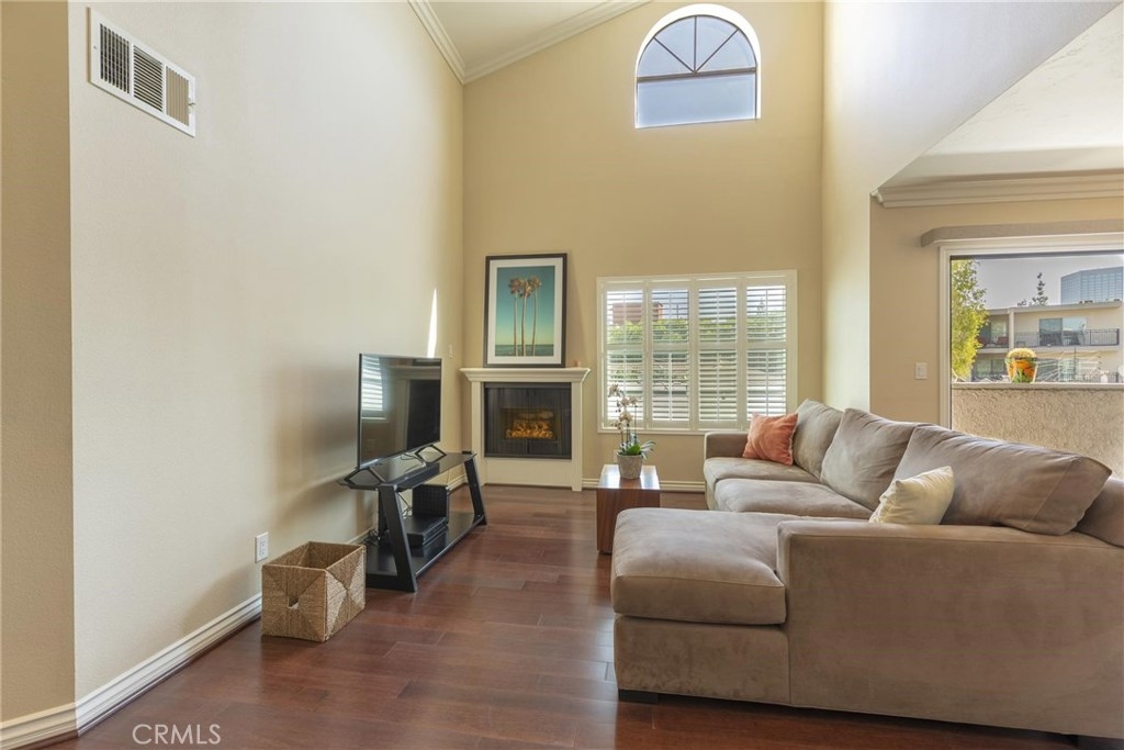 An exquisite Entertainer’s penthouse with treetop views in the heart of Studio City, this light & bright upgraded unit features designer finishes and elegant details throughout. The spacious living area is highlighted by a fireplace, crown moulding, new engineered bamboo flooring, and soaring two-story ceilings. The dining area sits just off the kitchen with direct access to a balcony, perfect for enjoying morning coffee or an evening cocktail. A gourmet kitchen showcases granite counters and backsplash, stainless steel appliances, and rich wood cabinetry. Upstairs, a large bonus loft with balcony enjoys views of Universal and the surrounding Studio City hillside. Perfect for a home office, media room, or third guest space, this loft offers a variety of options for the homeowner to enjoy. The romantic master suite with private bath and ceiling fan offers a fantastic walk-in closet, while a spacious guest room sits adjacent to a second full bath. Additional conveniences include newer dual pane windows, new carpet, recessed lighting, and plantation shutters throughout. Ideally located just steps from Ventura Blvd, enjoy everything Studio City has to offer.