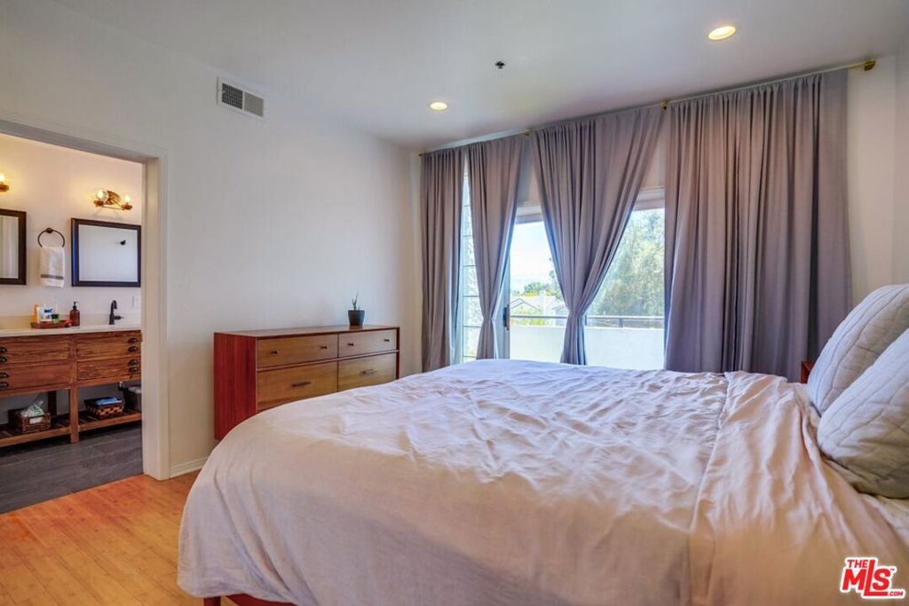 Boasting 1,269 square feet filled with natural light this exquisitely remolded contemporary 2 bed, 2 bath Studio City condo is just two blocks from Ventura Blvd. Coming home from a night out, pull into either of the two underground, gated parking spots. As you step off the top floor elevator, the outdoor walkway leads you to the electronic front door. As you stroll into the unit you are greeted with a light and bright space with soaring ceilings leading you to the renovated, crisp white kitchen showing off its impeccable chef's grade stove and finishes. Newly installed quartz counter tops will delight your guests as you entertain the night away. The first floor shares the primary en suite bedroom with walk-in closet, along with the generous guest bedroom with updated shared bath that will tantalize your senses. The living space with gas fireplace flaunts a spiral staircase that carries you to the private roof top deck for sunset al fresco dining and BBQs!