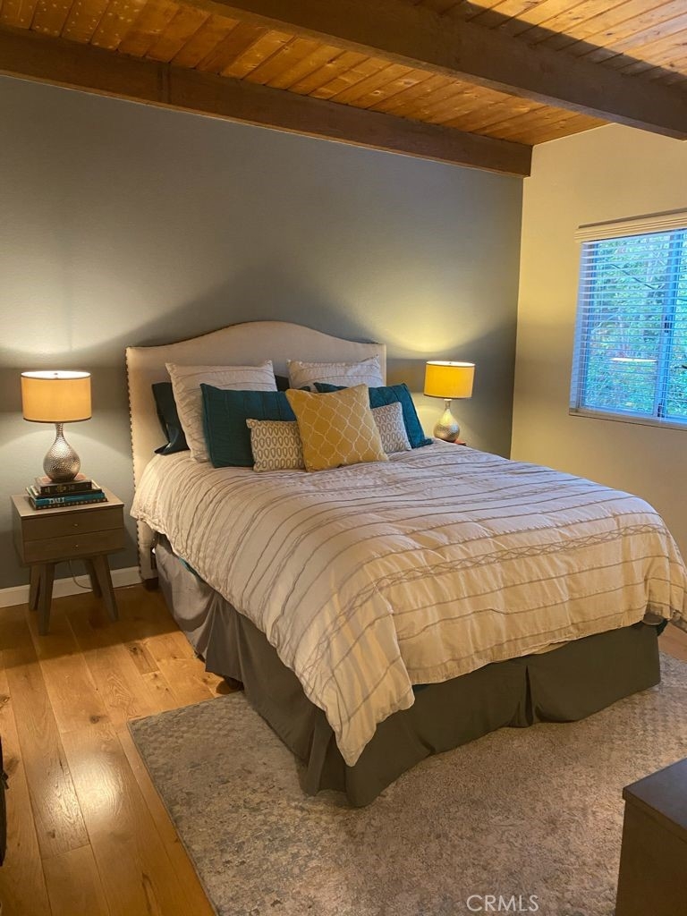 A beautiful 1BR/ 1BA condo in a small gated, pet friendly community in prime Studio City. This upper unit is located in the back of the building, away from street noise and looks out to tall green foliage from every window. Extremely quiet, and no neighbors on either side. The living room and bedroom feature beautiful wood beamed vaulted ceilings that create warm feeling in each room. Gas fireplace in the living room and lots of natural light from the balcony door. Wood flooring throughout with tile floors in the kitchen and bathroom. Kitchen and bathroom have been previously upgraded. Stainless steel appliances and granite counters. Laundry hookups inside closet in the hallway. Two car spaces assigned in underground parking with an additional storage area. Community has controlled access, a patio sitting area, and a pool. Located just across from Weddington Golf & Tennis Club and in walking distance to restaurants and shops on Ventura Blvd. Easy access to freeways and public transportation. A Must See!