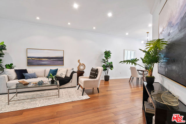 A bougainvillea adorned gate with secure keypad access welcomes you to this recently renovated, 2 bed/2.5 bath Mid-Century tri-level Townhome, located in the back of a tranquil garden 10 unit courtyard, shaded by mature trees in the heart of Studio City. This special home offers an ideal light and airy floor plan with high ceilings, sustainable bamboo floors, multiple skylights, recessed lighting, newer energy efficient windows and plantation shutters throughout. Open concept living and dining with indoor/outdoor access to a tree-top balcony, Custom cook's kitchen with quartz counters and European eco-friendly appliances. Upstairs, spacious primary suite with its own balcony, 2 large closets and updated bath with modern dual vanity, plus an additional guest bed and bath. Convenient main floor powder room for guests, full size washer/dryer and abundant storage in unit. Nest thermostat, Newer HVAC, EQ Insurance. Side by side parking in secure garage with direct access entry. Stroll to the newly opened Sportsmen's Lodge retail center featuring Erewhon Market, Equinox Fitness, Sugarfish Sushi and an array of restaurants and boutiques and be a stone's throw from the best of everything Studio City has to offer!