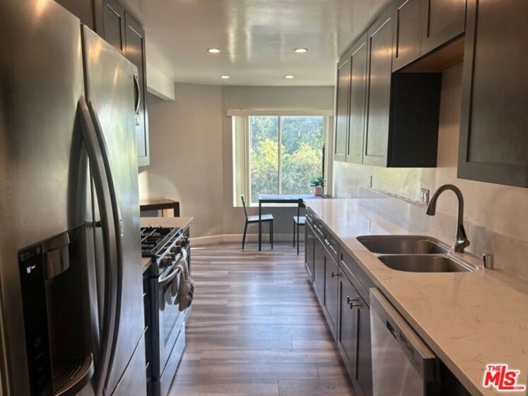 Stylish new flooring flows into an updated kitchen featuring quartz countertops, soft-close cabinetry, and stainless-steel appliances. The inviting living room includes a cozy gas fireplace and a built-in entertainment center. The bathroom offers a modern vanity with hidden plug access, while the bedroom is complete with a spacious walk-in closet. Recessed lighting has been recently added throughout, and the home is equipped with central heat and air. Each floor of the building, including the ground level, provides a laundry room with free washer and dryer access. Additional highlights include two covered tandem parking spots and a shared outdoor recreation area with a barbecue grill. This quiet, well-kept 14-unit complex is just a short stroll to the trendy shops and dining of Tujunga Village.