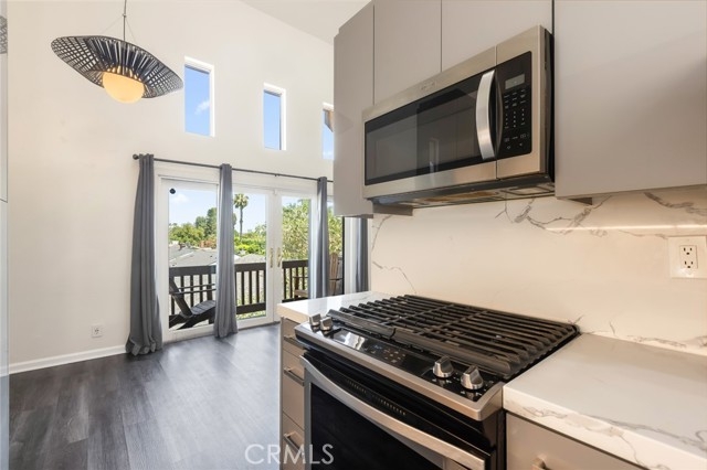 This two-bedroom, two-bathroom condo with 2 parking spaces has been thoroughly maintained and cared for over the years. The formal entryway leads to the living room with high ceilings, fireplace and sliding doors with a balcony and treetop views. The open floorplan is perfect for having friends and family over to entertain and hang out with. The kitchen was remodeled and features a stainless-steel range, microwave, refrigerator and sink, custom cabinets and stone countertops. One bedroom and bathroom downstairs and primary bedroom upstairs with attached bathroom. Both bedrooms have tons of closet space. The serene pool area is located in the rear of the property and has several lounge chairs, a barbeque and tables with chairs and umbrellas. This is a perfect place to relax after a long week of work. There is a common laundry room for the complex and the HOA has approved installing washer/dryer inside units.