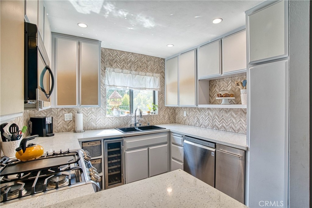 Welcome home to your bright and beautiful top-floor condo in the heart of Studio City! This gem on Laurel Canyon Boulevard has been lovingly updated in the last three years. Enter from the secure, quiet courtyard of this 12-unit building and walk up to your spacious living room, complete with a gorgeous newly-tiled fireplace and soaring high ceilings which continue into the dining area as well. Open the doors to your private patio for a lovely breeze, or sit out and enjoy the fresh air. The expanded kitchen boasts new quartz countertops, a new sink, tiled backsplash, built-in water filtration system and matching stainless steel appliances including a wine fridge. Continue into your large master bedroom and enjoy two closets including a cedar-lined walk-in, plus a private master bathroom that has been retiled and fitted with a new shower, and a color-changing light/fan with Bluetooth speaker. Both bedrooms have recently-added ceiling fans and new solid core doors for additional soundproofing. This condo has newer flooring throughout and in-unit laundry. The second bedroom also has a cedar-lined walk-in closet and an adjoining updated bathroom. Park conveniently in your side-by-side parking spaces in the gated garage, and stash away extra items in your designated storage cubby. The condo also has an August Wi-Fi smart lock on the front door and Ring doorbell for added security. Imagine being within walking distance to Ventura Blvd. and Moorpark Park, the Farmer's Market, groceries, Starbucks and much more! With a top-rated school district, low HOA fees, and every convenience at your doorstep (including quick and easy access to the 101 and Laurel Canyon) this turnkey home has everything you've been waiting for.