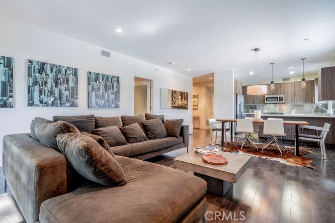 Welcome to this stunning Penthouse unit located south of the Blvd in prime Studio City w/ views of hillside & Universal City. Upon entry you will experience the perfectly functional floor plan, harmonious energy & sun filled rooms. This chic unit offers 3BR + 2.5 BA, approximately 1,691 sq. ft. of living space & balcony that looks out onto the tree lined street. Enjoy cooking in the open gourmet kitchen w/ Caesar stone counters, SS back splash, top of the line appliances & European wood laminate cabinets. The open living-dining rm. features Canadian maple wood floors, gas fireplace, recessed lighting & wood window blinds. Retreat to the master suite w/ large spa-like bath, dual sink vanity, & a large walk-in closet w/ custom built-ins. Other features include: stackable laundry inside unit, alarm system, & 2 tandem parking spaces. The building has a landscaped entry & courtyard, water fountain, outdoor public terrace on the 4th fl., fitness center & a business center. Enjoy living close to Universal city, metro red line & minutes from Hollywood. This is a special unit!