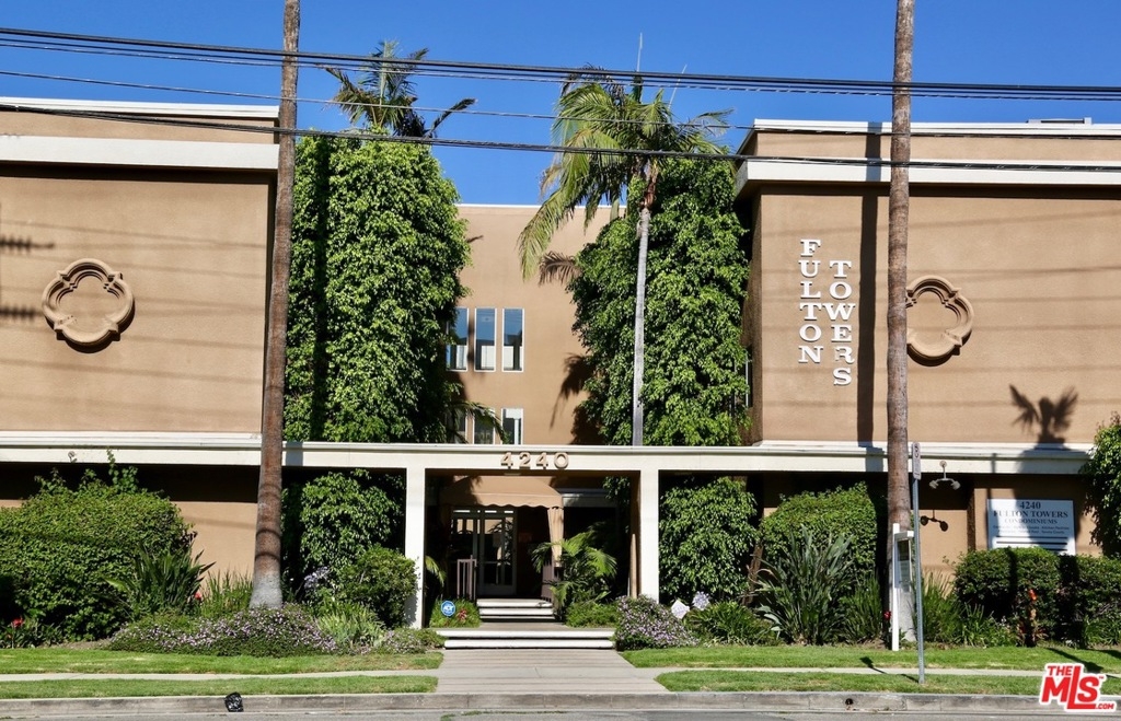 Proudly presenting a 1-bed 1-bath condo with almost 1200 sq ft of living space, located within minutes of shops, restaurants and cafes along Ventura Blvd in Studio City! This highly sought after corner unit has been lovingly maintained over the years and features an open concept layout with hardwood floors, recessed lighting, a beautifully crafted fireplace and built-in bookshelves. A wall of sliding glass doors in the living room provides access to an incredibly spacious covered patio, seamlessly integrating this tranquil and private outdoor space into the home. The kitchen offers all the counterspace a culinary virtuoso could crave and there are plenty of cabinets and a walk-in pantry for storage. The primary bedroom is bigger than some NYC apartments(!) and features a walk-in closet and 2nd smaller closet. A full bathroom has a tub with shower overhead and a large vanity. Several closets in the unit offer tons of extra storage space. Fulton Towers is impeccably maintained with lush landscaping, a sparkling pool and newly resurfaced tennis courts. Additional amenities: central air + heat; 1 parking space in gated parking lot; on site guest parking; community laundry.* HOA Dues include earthquake insurance, water, garbage, cable, internet, sewer and maintenance.