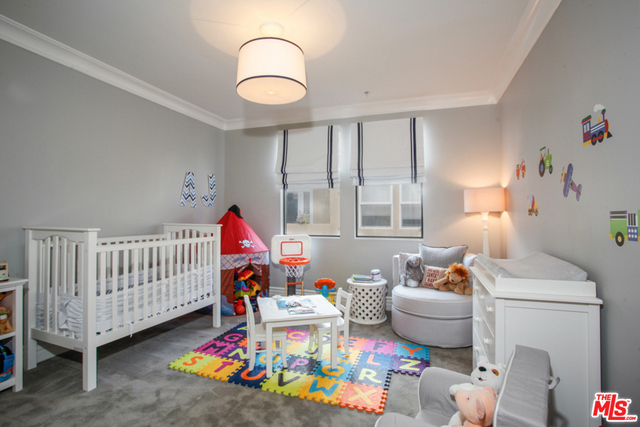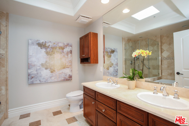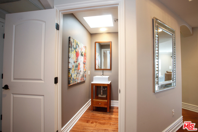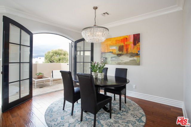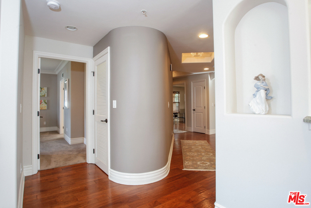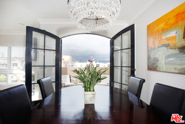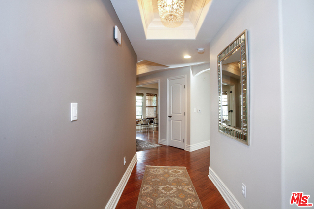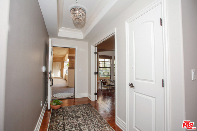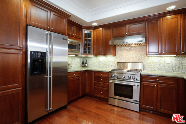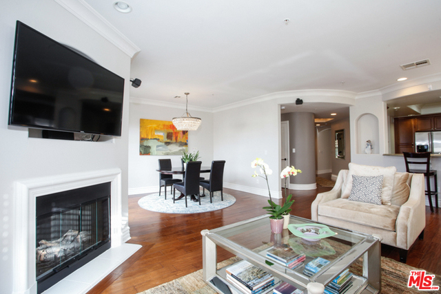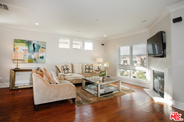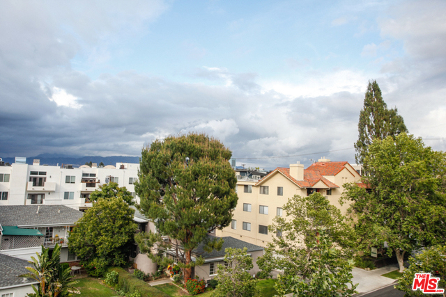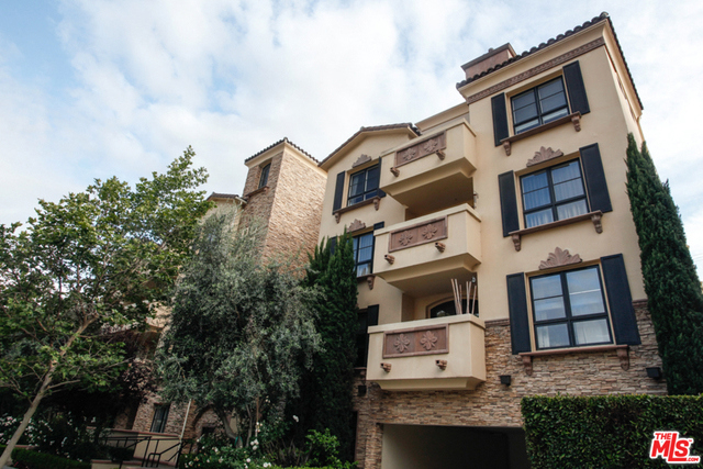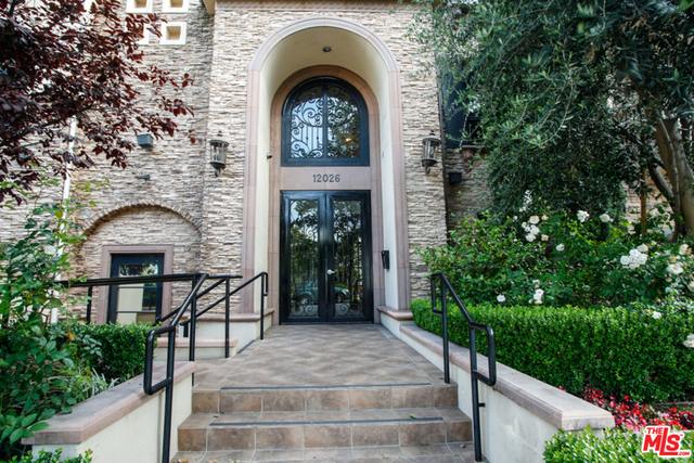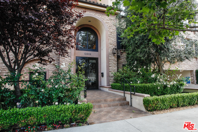 Elegant corner front-facing unit on one of the area's best tree lined streets. Close to Joans on Third, CBS Studios, Trader Joes, Dupars and the current trendiest cafes and shops. Impressive secure entrance with palms and courtyard fountain evoke a European style villa. Excellent floor plan with hand-hewn style wood floors throughout the public spaces. Formal entry and hallway with coffered ceilings lead to an oversized gourmet kitchen with granite counters, SS appliances and breakfast bar. Bright open living space with fireplace, surround sound and dining area with french doors opening to a generous terrace. Northern veiws look to the San Gabriel and Verdugo Mountains. Large Master bedroom featuring high ceilings, walk in-closet and large en-suite bathroom with double sinks, soaking tub and shower. The front third bedroom doubles as an office or den. Guest bedroom with custom shades and matching light fixture share another full bath, Laundry in unit.