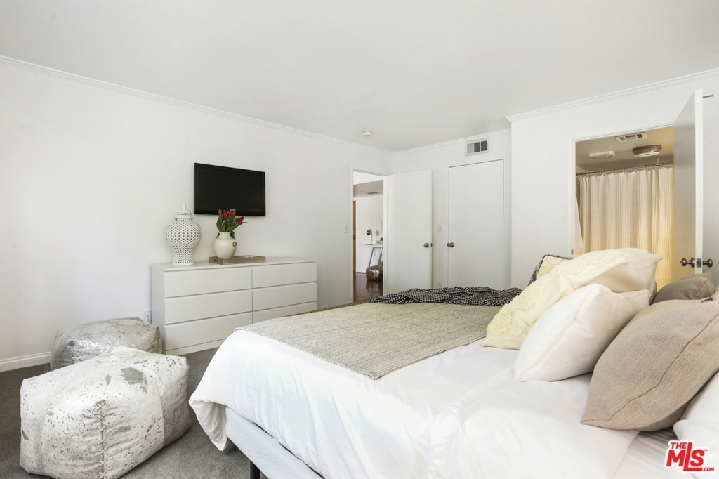 Chic condo in the heart of Studio City combines refined interiors and a vibrant location. Living room and dining area are sun-filled with hard wood floors, sliding glass doors, gas fireplace in earthy grey clay tone, and oversized balcony that overlooks the refreshing pool. Orb capiz pendulum light over dining table is a splendid decorative touch. Well-designed kitchen offers stainless steel appliances, drawer refrigerator/freezer, inlaid wood parquet butcher block countertop, octagonal designer floor tile in grey hues, and vertical washer/dryer in closet. Two sizeable bedrooms with en suite bathrooms are ideal. Spacious primary bedroom with gray carpeting, huge walk-in closet, and well-appointed renovated bathroom with marble tile floor. Second bedroom with balcony overlooks a North Valleyheart River Walk. Subterranean parking provides 2-car side by side parking and storage. LMirage is a well maintained small 27-unit complex with pool and barbeque. Building is adjacent to North Valleyheart Riverwalk access point. Enjoy well-landscaped bike paths of solitude native plants and shrubs. So close to favorite Studio City Eateries Casa Vega, Susie Cakes, Great Greek, Petit Trois, and Mistral.