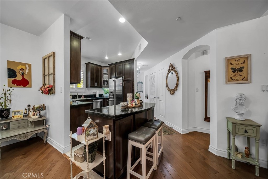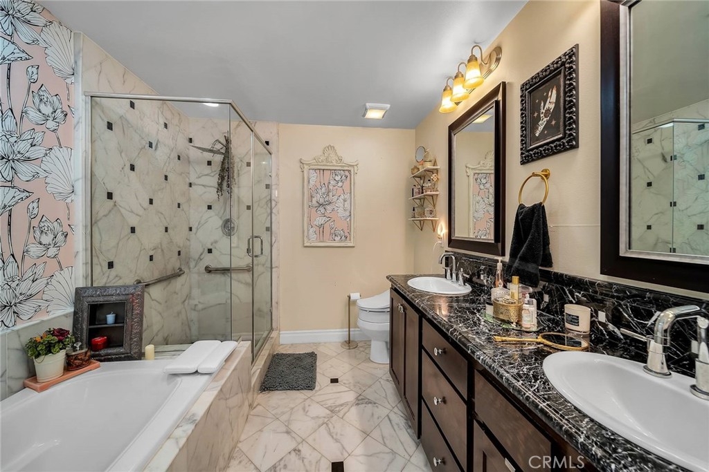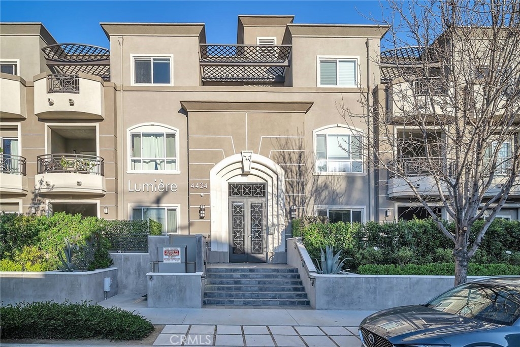 Through the beautiful courtyard at Lumiere with lush palms and seating area with fireplace, guests are greeted by this rare first floor unit at the back of the building (not facing Whitsett) with a formal entry, gleaming hardwood floors, fresh new white paint (after photos were taken), and designer touches throughout. The open concept Entertainer’s floor plan showcases a corner fireplace, statement wall, formal dining area, and sliding door to a quiet balcony. The gourmet Chef’s kitchen features rich wood cabinetry, black granite counters, stainless steel appliances, island with breakfast bar, and a double sink overlooking the courtyard. The romantic master suite enjoys wood floors, spacious closets, direct access to the balcony, and a spa-like master bath with Carerra marble dual vanity, oversized glass shower, and separate soaking tub. A large guest room has plush carpeting and a lovely adjacent bath with combo bath/shower. Additional conveniences include in-unit laundry, off-street guest parking, and two side-by-side designated parking spots - one being the first spot outside the elevator! This premiere building is meticulously maintained, enjoying an impressive gated entrance, center courtyard with fireplace, tranquil zen garden, and well-appointed fitness center. Enjoy everything Studio City has to offer, located near Ventura Boulevard’s fine dining, shopping, and more!