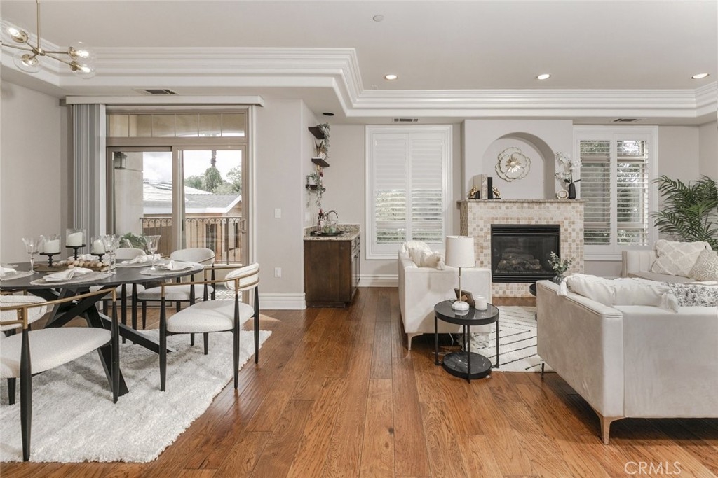 This contemporary luxury condominium is nestled in the heart of vibrant Studio City, just a few blocks from the fashionable boutiques and dining spots of Tujunga Village and Ventura Blvd. A modern residence serves as an ideal option for those seeking a sweet and quiet home in this desirable and upscale neighborhood. Boasting 3 bedrooms, 2.5 bathrooms, and over 1,500 square feet of living space, it’s spacious and thoughtfully designed. Situated on the second floor, this unit feels like a private home, offering both seclusion and practicality. Enter through a welcoming foyer that opens to an expansive, open-concept living and dining area with lots of natural light, high ceilings, elegant moldings, solid wide plank maple hardwood floors, a stone-accented gas fireplace, a built-in wet bar, and a balcony with unobstructed southern vistas of the mountains. The gourmet kitchen is a chef’s delight, equipped with stainless steel appliances, marble countertops, stone-tiled backsplash, and rich wood modern cabinetry. The generous master suite boasts mountain views, a large walk-in closet, and a beautifully appointed en-suite bathroom with oversized tub separated from the shower. The modern mediterranean building provides secure gated access to the garage and lobby, with two designated parking spaces, a locker, and ample guest parking. For those with electric vehicles adding a charger is a simple option. The well-managed HOA features a generous reserve fund, and earthquake insurance. The lobby, mailroom, and elevator are also secured with smart coded access. This property is within the highly desirable Colfax Charter Elementary and Carpenter Community Charter School District and offers scenic views of the Hollywood Hills from the rooftop terrace!