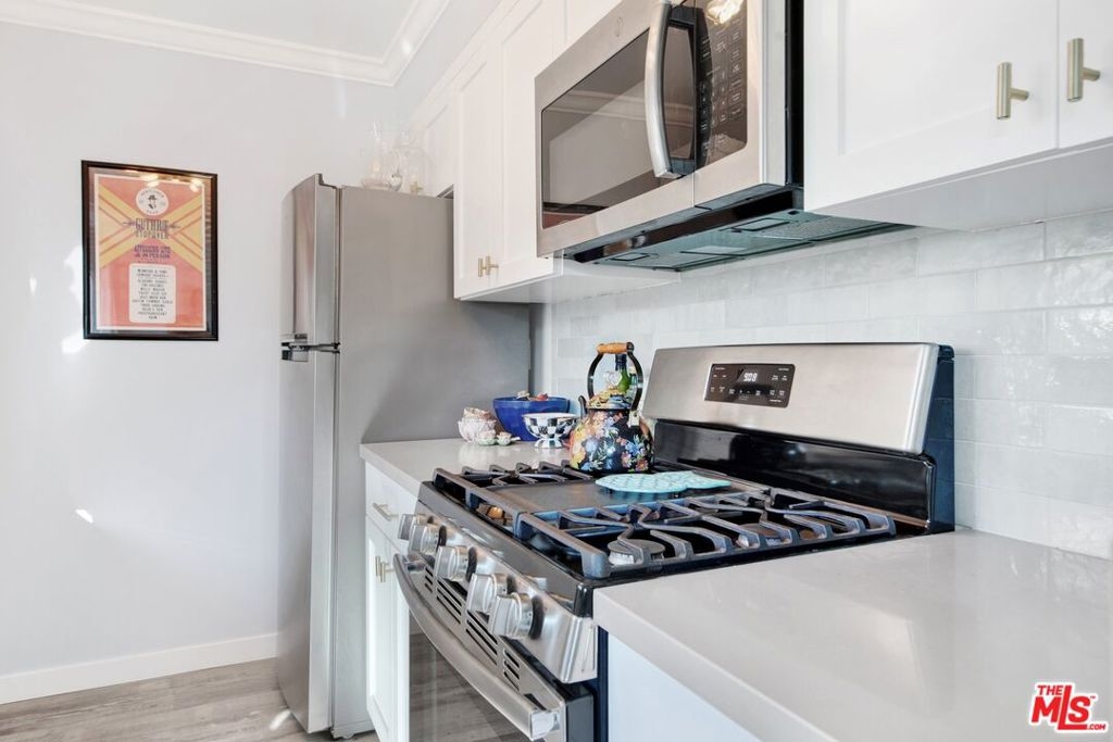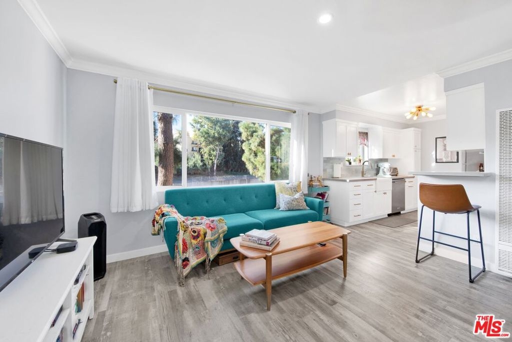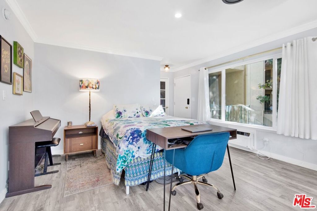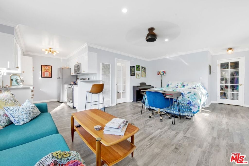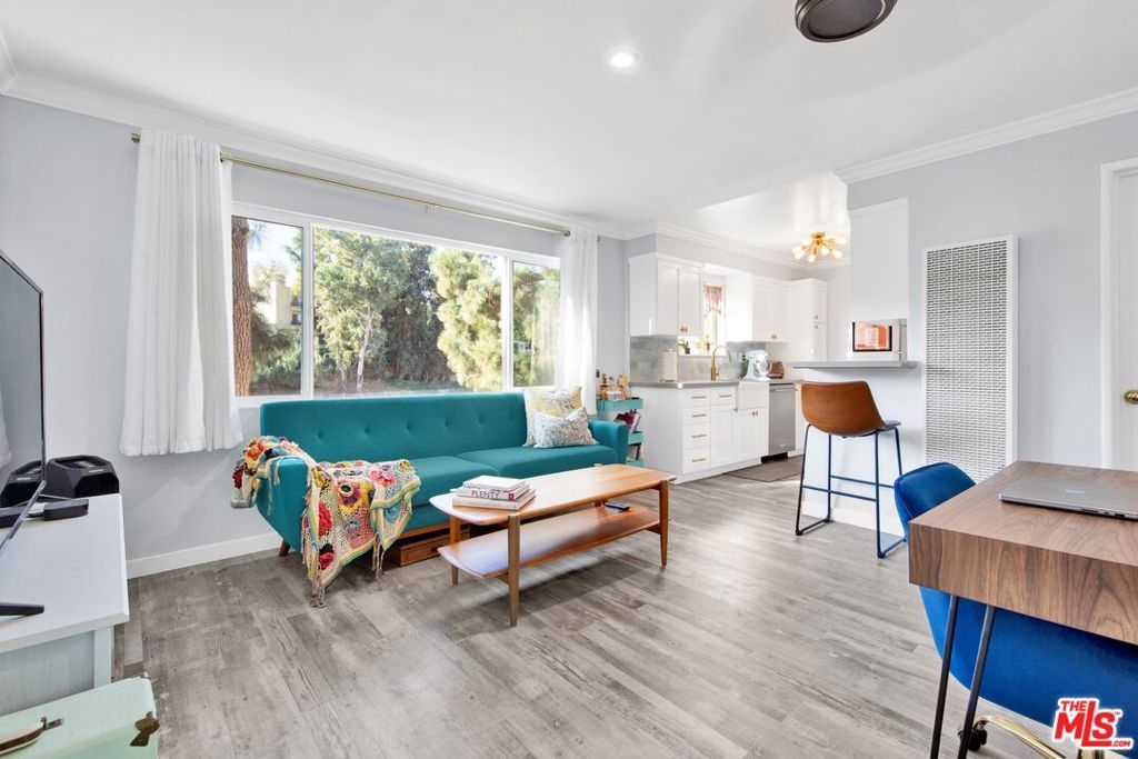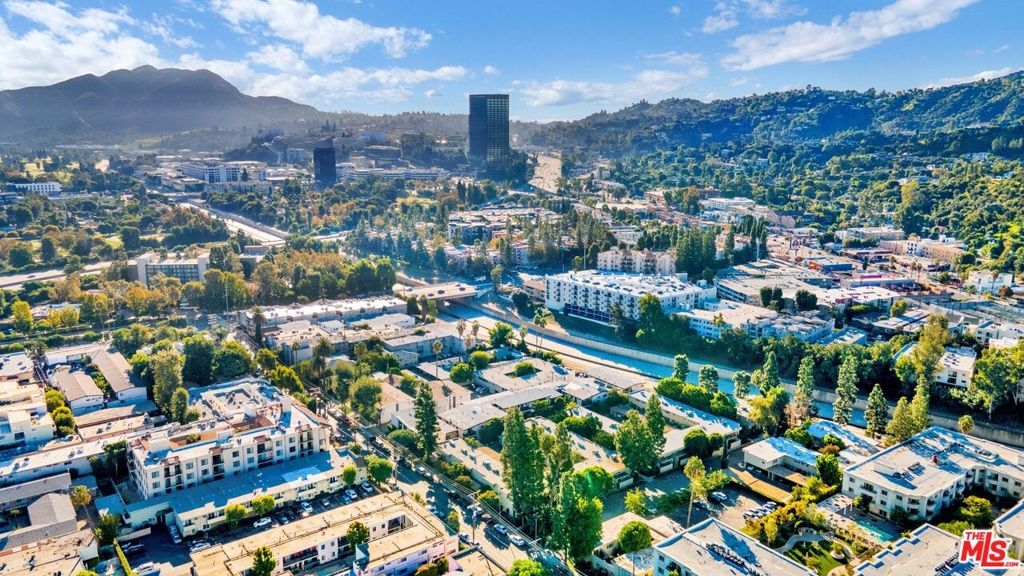 This beautifully remodeled studio condo is located in a quiet community right on the border of Studio City, North Hollywood, and Toluca Lake, just a short drive from Universal City and Hollywood. The condo features stunning green-space views of the LA River, and has been completely updated with a new kitchen, bathroom, luxury vinyl plank flooring, low e3 triple-pane windows, wifi-enabled wall AC unit, and paint. The open floor plan makes the space feel bright and airy, and the semi-private balcony is the perfect place to relax and enjoy the views. The kitchen is fully equipped with quartz countertops, blue pastel subway tile backsplashes, stainless steel appliances, and the bathroom features a large subway tile walk-in shower. You'll have plenty of space for your wardrobe in the large, custom-built closet in the hall leading to the bathroom. The condo also comes with one assigned semi-private garage space with additional storage cabinets. This community offers a variety of amenities, including a swimming pool & spa and laundry facilities (note: per seller, the HOA does allow for in-unit laundry installation). HOA is not FHA/VA approved, but Seller is open to exploring spot approval options with FHA/VA buyers. See the last three pictures for a design concept to wall off a bedroom if a 1 bedroom layout is preferred to the existing studio layout.
