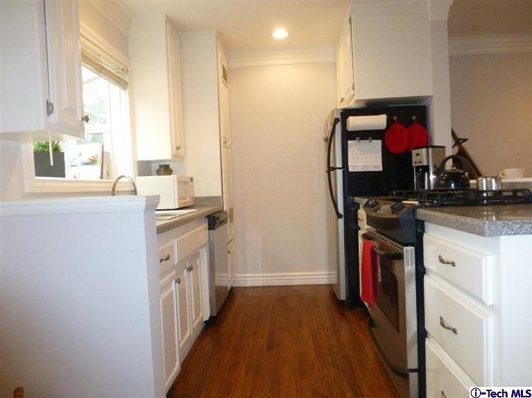 This cozy home offers charm and warmth surrounded by lots of lush greenery. The living room is spacious and is open to the dining area and kitchen. The kitchen has lots of natural lighting, newer counters, appliances and a breakfast bar. The bathroom is updated w new fixtures and the large bedroom offers a custom built in closet & new light fixtures. There is a private back patio off the bedroom with new fencing and direct access from the parking area. Only one other unit offers a private patio this size. Interior features include wood flooring, new double pane windows, recessed lighting in all rooms, crown molding, beadboard, warm colors and beautiful new light fixtures. Not only is this one of the best locations in Studio City, this is central to Dowwntown, Hollywood, NOHO and the Burbank studios. Ventura Blvd, Tujunga Village & Aroma Cafe are minutes away. The complex is full of lush greenery, a dog walk, a beautiful pool/spa plus lots of visitor parking and two tandem spaces.