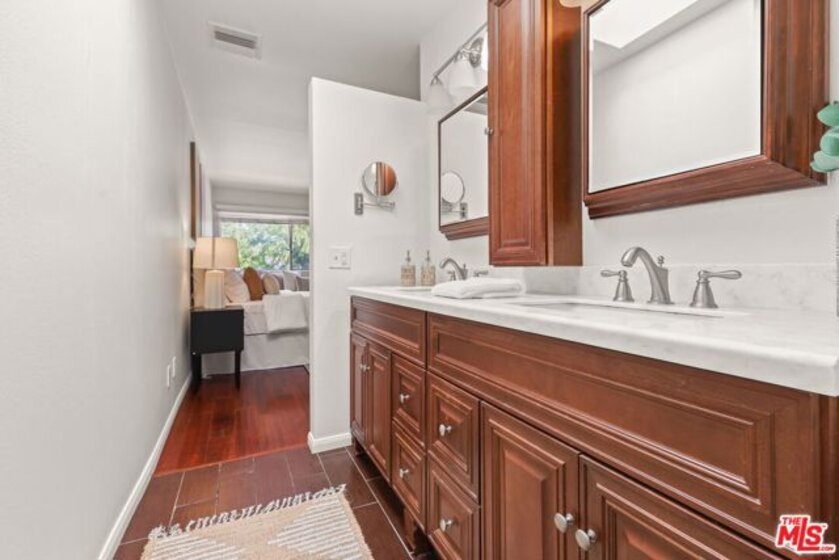 Gorgeous townhome with private, direct access 2-car garage in Studio Village, one of Studio City's most sought-after communities. This tri-level townhome feels like a single family home. Standout features include 2 Bedroom Suites + Den + 3 Bathrooms! Both upstairs bedrooms include their own en suite bathroom and walk-in closet. Plus, there's a den and 3rd bathroom down the hall from the main floor dining room. Step inside the front door and be wowed by the vaulted ceilings, skylight, and clean architectural lines, all bathed in an abundance of natural light. The split-level design features a spacious living room with fireplace and sliding doors that lead to an enclosed outdoor patio. The dining room with built-in bar/buffet offers a dramatic overlook of the inviting living room. The updated eat-in kitchen features Viking range, brand new stainless steel refrigerator, dishwasher & microwave, plus granite countertops. Also features gorgeous engineered wood floors throughout the home, along with central heat & air conditioning controlled by a Nest thermostat. You'll love the private direct access 2-car garage with laundry area and loads storage cabinets. Enjoy indoor-outdoor living with your own private patio off the living room, ideal for BBQs and al fresco dining. The home has just been freshly painted throughout! Studio Village offers resort-style amenities including 6 sparkling pools, 5 spas, 2 tennis/pickleball courts, and community clubhouse. The monthly HOA fee covers a lot, including water, internet, basic cable, exterior maintenance, landscaping, security patrol, and earthquake insurance. All this in a prime Studio City location just two blocks to trendy Ventura Boulevard where you'll find popular restaurants, cafes and shopping, plus top-rated schools (including Carpenter Community Charter School District), and easy access to CBS Radford Studio and 101 & 134 freeways. Also, near Tujunga Village, Woodbridge Park, and the Sunday Studio City Farmer's Market!