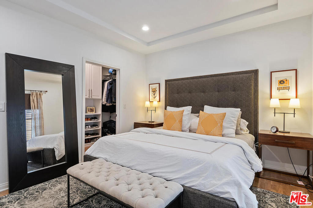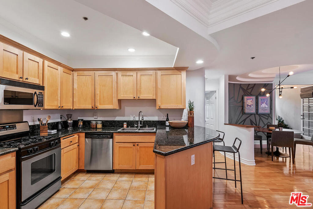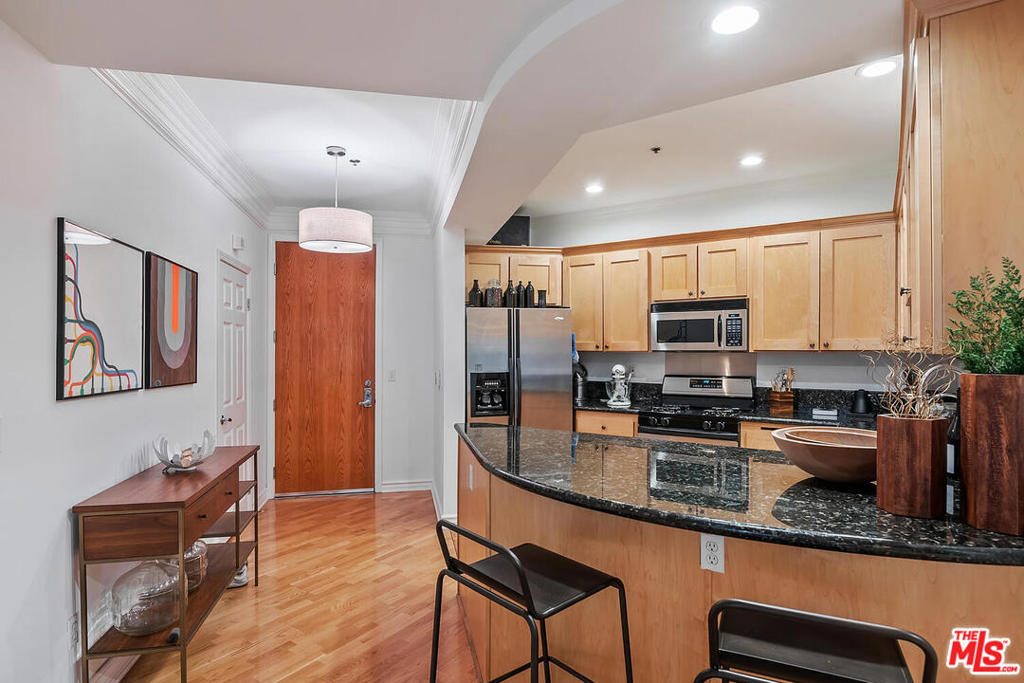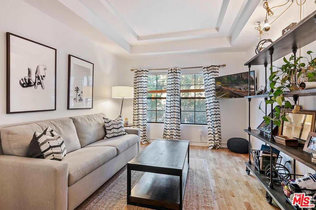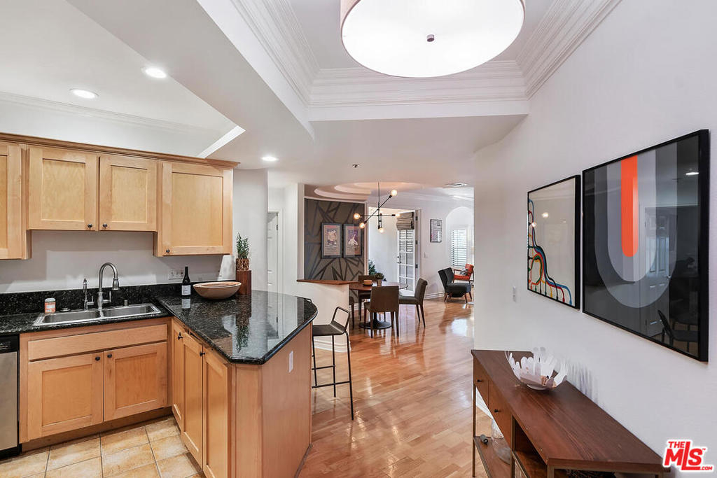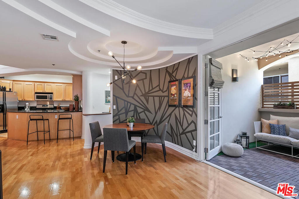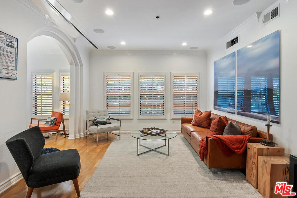 Spectacular designer-sharp quiet, single-level condo in iconic Studio City Spanish style building, adjacent to Beeman Park. Unit boasts 2 generous sized bedrooms and 2 full baths. Inviting owners suite features vaulted ceilings, ensuite bath with tub/shower and custom walk-in closet. 2nd brightly appointed bedrm adjacent to secondary bath. Open, spacious granite kitchen with stainless steel appliances, stone tile floor, & breakfast bar. Inviting circular dining area with artistic lighting, custom wall treatment, unique ceiling detail opening to large entertainers living room. Enjoy movie night, with high-end custom home-theatre electronic screen and built in recessed state of the art projection equipment. Perfect home office/den/guest retreat, w/ cozy fireplace adjacent to LR. Delightful and quiet bright custom designed balcony off living room, perfect for al-fresco dining or a relaxing siesta. Lightly finished hardwood floors and recessed lighting throughout. In-unit laundry with stacked washer/dryer. This home features only 1 adjoining wall, beautiful lush landscaping and open interior courtyard. This amazing condo is move-in ready. Strong HOA includes EQ ins, Spectrum premium cable & high-speed internet. Steps from coffee shops, restaurants and Ventura Boulevard. Welcome home!