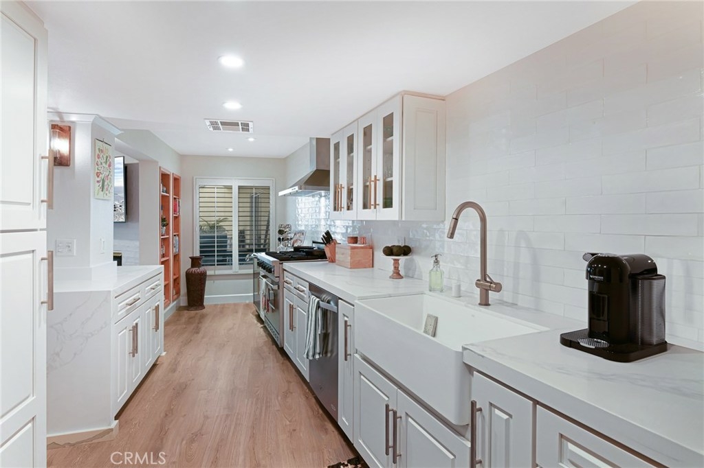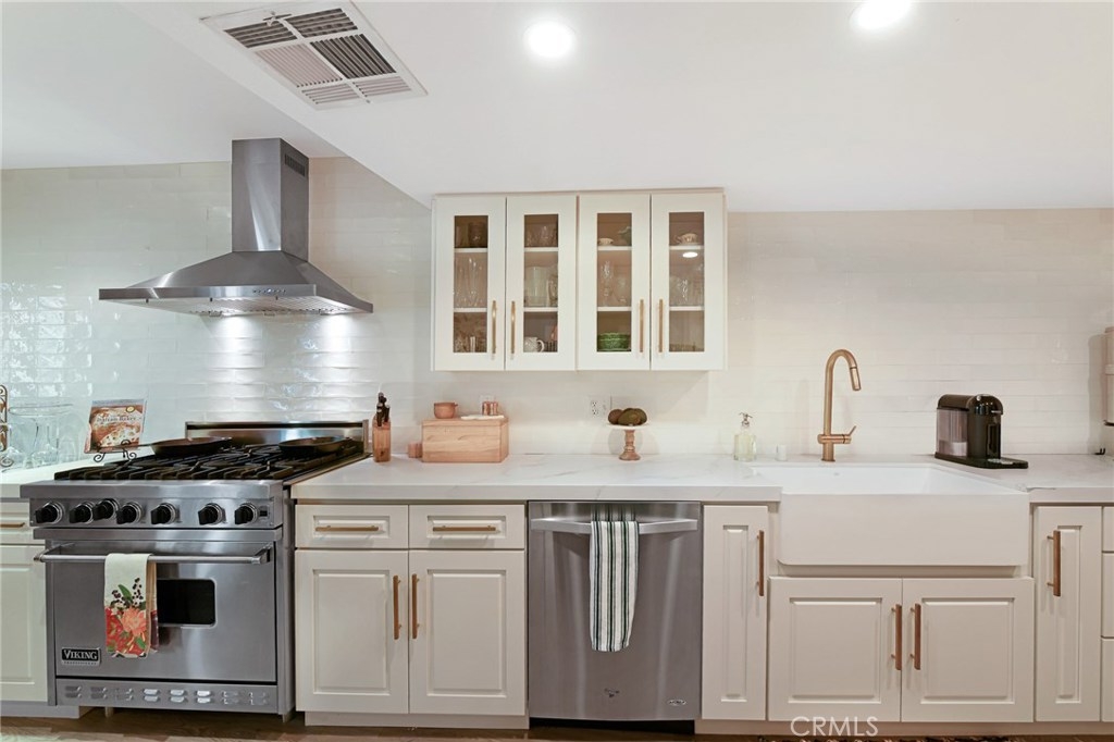 Walk into this stunning open concept remodeled great-room with wide plank wood floors & brand new professional kitchen that showcases a Viking range, gleaming white tile & custom cabinets that include designer luxe gold fixtures. After a swim in the South-facing pool relax on your own sunny private courtyard patio that’s easily accessible from the living area. This extra large main-level unit not only includes a very spacious master suite, but an equally impressive second bedroom & bath. Both bedrooms have extremely large walk-in closets, with an additional huge walk-in closet off of the stairs, plus hall cabinets & a coat closet to accommodate all of your storage needs. In addition the laundry accommodates a full size washer & dryer and is located just a few feet from the bedrooms. Perfectly located for a short walk to shopping & restaurants on Ventura Blvd or the LA river trails across the street for exercise! Quick access to the 101 freeway or Coldwater Canyon into Hollywood.