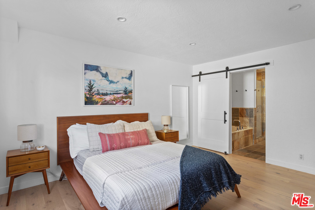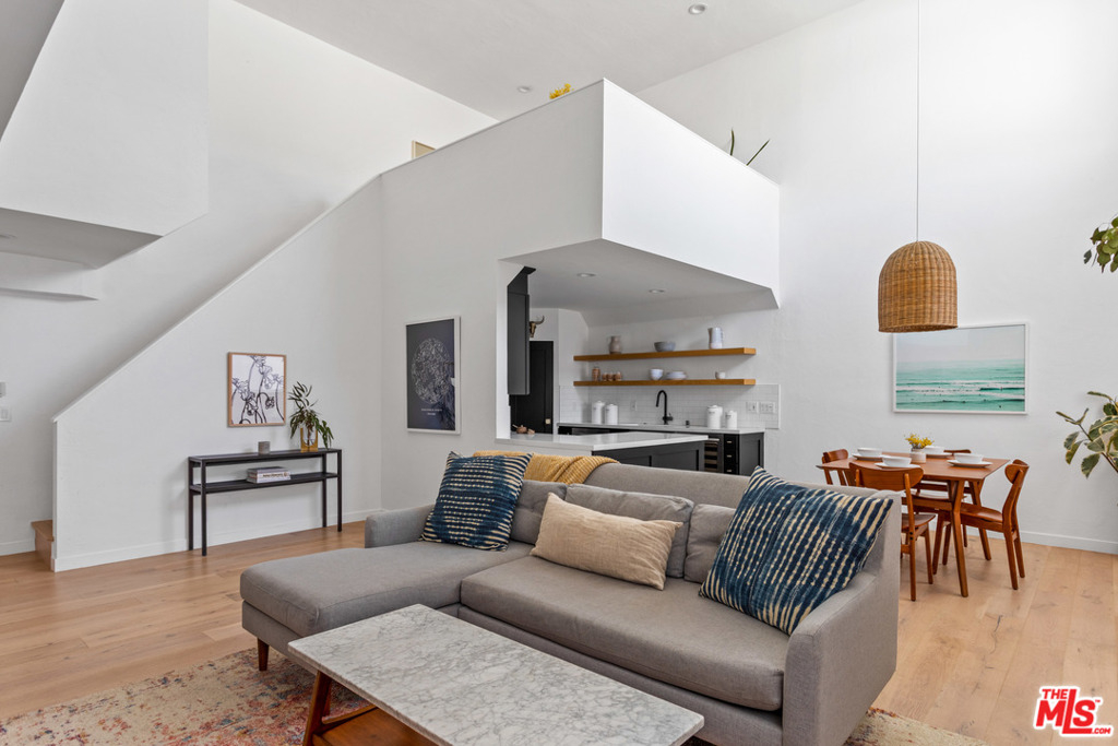 This coveted split-level penthouse was thoughtfully renovated in 2018, bringing to life its full architectural potential. Soaring ceilings allow natural light to pour in across the white oak floors and throughout the open concept living and dining area. The sleek, contemporary kitchen boasts a neutral palette with quartz countertops, wood and brass accents, and a built-in wine fridge. A separate loft space perched above the kitchen offers a multitude of functions, perfect for home office or studio. One of the two spacious bedrooms downstairs is en-suite, and the upstairs en-suite opens onto a private rooftop deck with custom built-ins and an outdoor bed and bench. 13030 Valleyheart is nestled in between Ventura Blvd and the LA River trail, giving you equal opportunity to head out the door for a quiet bike ride or to any of the dozens of beloved institutions along the Blvd. Iroha Sushi, LPQ, Casa Vega, Bluebird, Erewhon, and the Studio City Farmers Market are all nearby, and the full opening of the Shops at Sportsmens Lodge--including an Equinox--is imminent.
