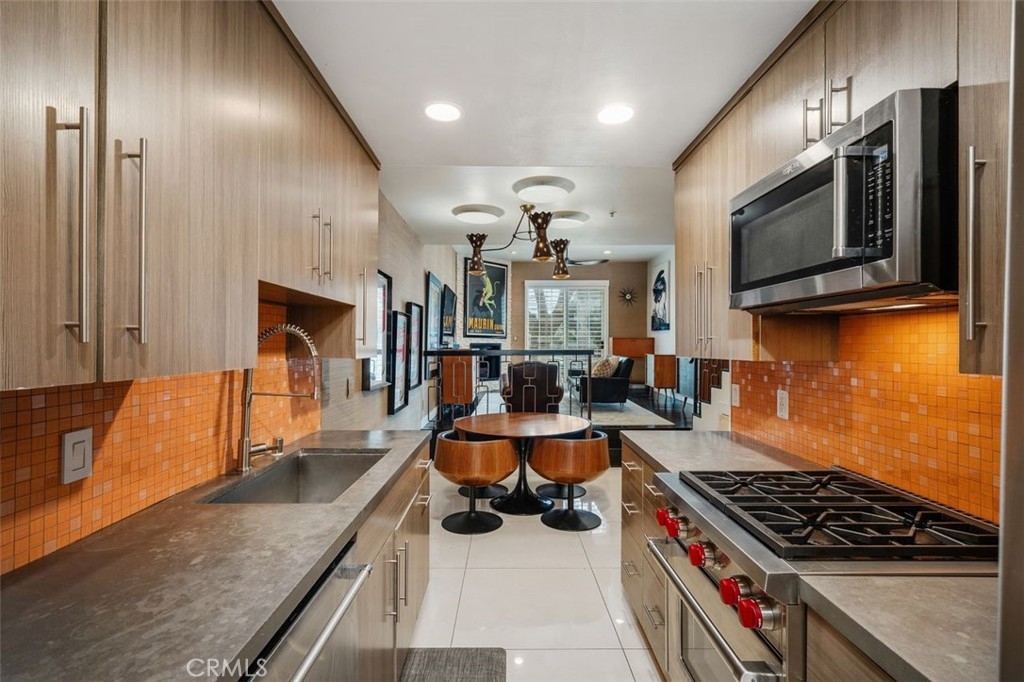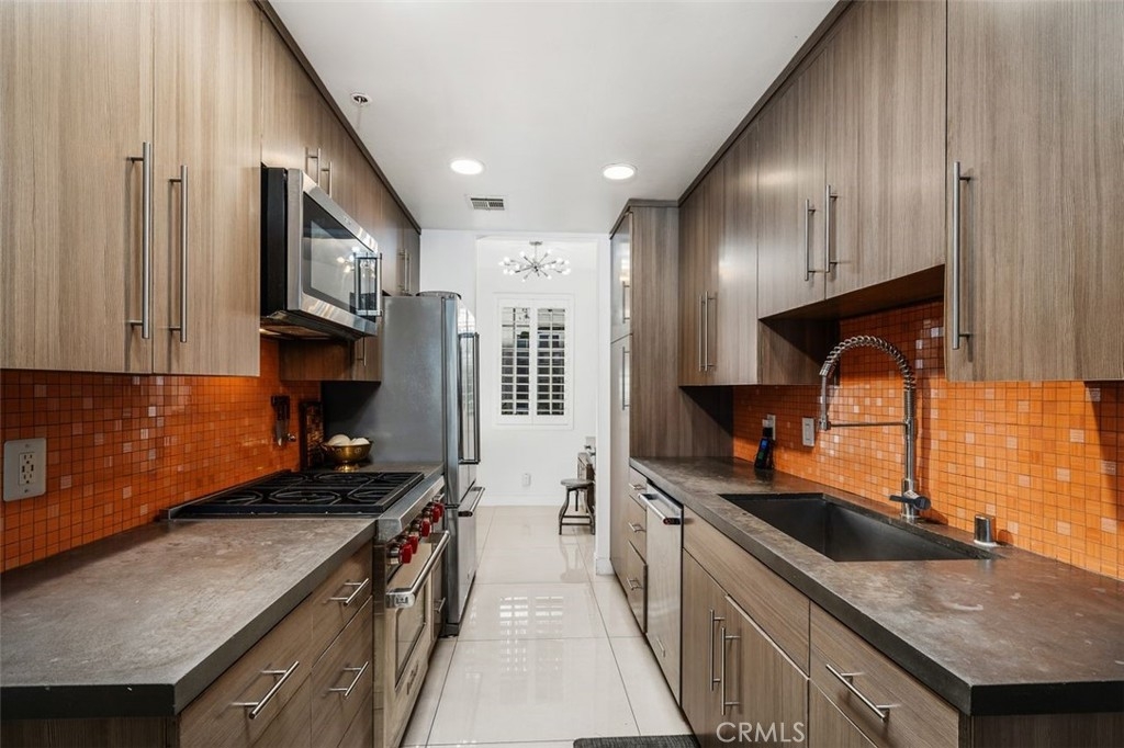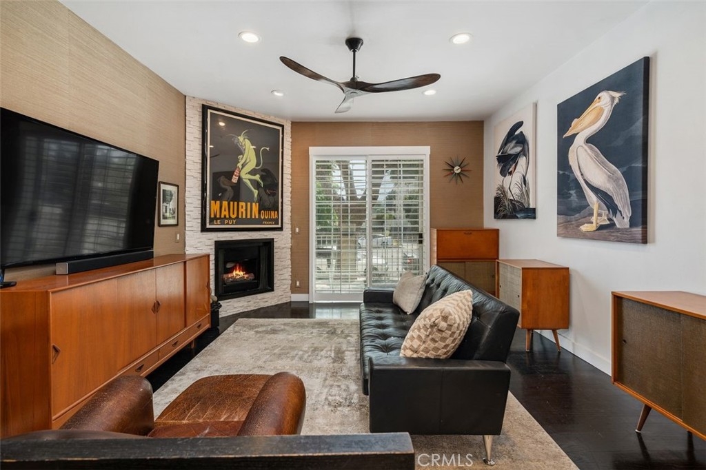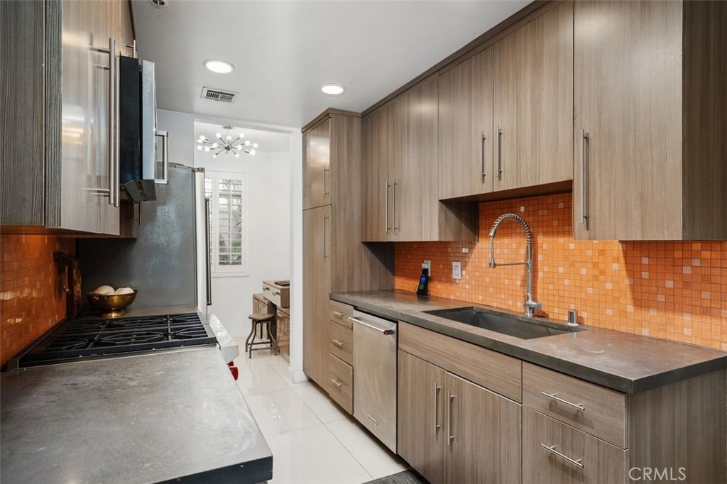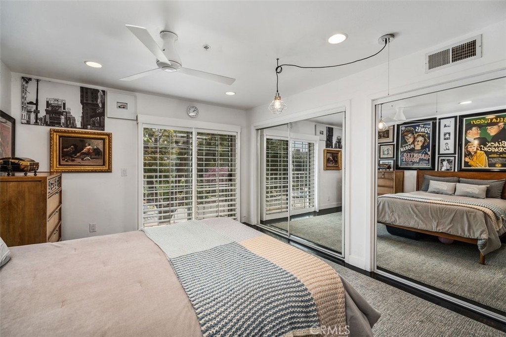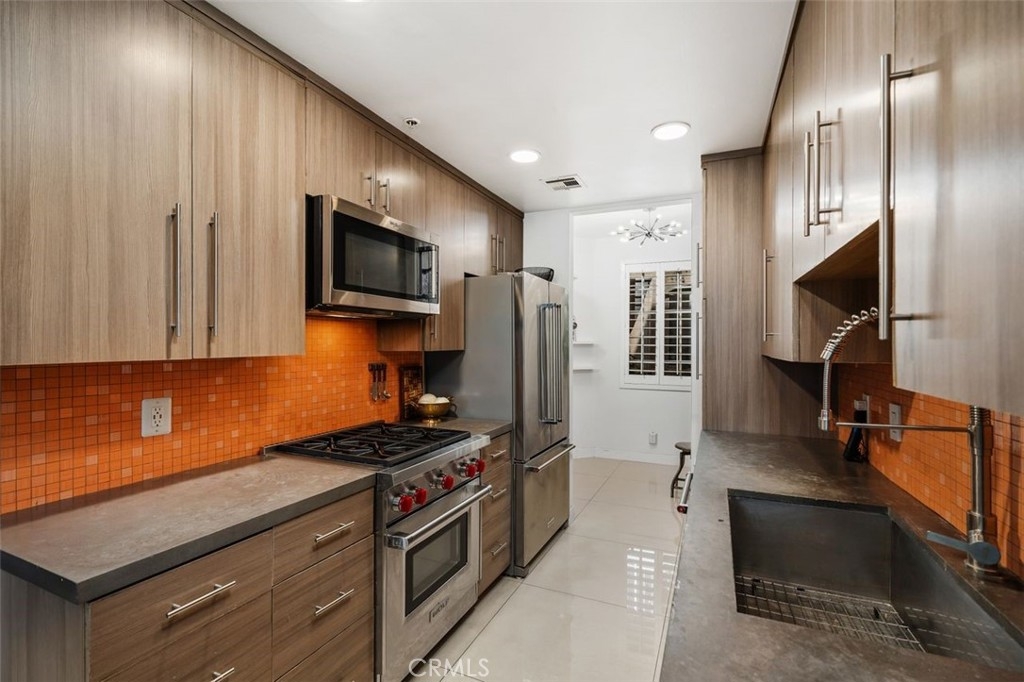 Welcome to this amazing condo in Colfax Meadows one of the premiere neighborhoods of Studio City! This secured building has a classic Mediterranean design that is truly gorgeous and pleasing to the eye. This freshly painted, two bedroom, two and a half bathroom invites you to an open-concept floor plan with a luxurious custom made staircase, recessed lighting and high ceilings. A completely modern galley style kitchen awaits with high-end stainless-steel Wolf and kitchenaid appliances, newer cement countertops, a spacious dining area that is truly inviting and office nook. The elegant living room presents a modern fireplace, large sliding French doors and a sprawling tiled balcony with street views. The primary suite presents floor to ceiling mirrored closets a balcony and a bathroom with soaking tub and walk-in shower. Fresh wallpaper, dynamic plantation shutters and custom light fixtures throughout give this condo great style and elegance. Additional features include an in-unit stackable set of Fridgidaire washer and dryer. Amenities include controlled access, gated subterranean tandem parking for two cars and a private storage space. This stunning home is just moments from Tujunga village shops, the Studio City farmers market, prestigious schools, upscale shopping, numerous freeways, many studios and the best restaurants on Ventura Blvd.