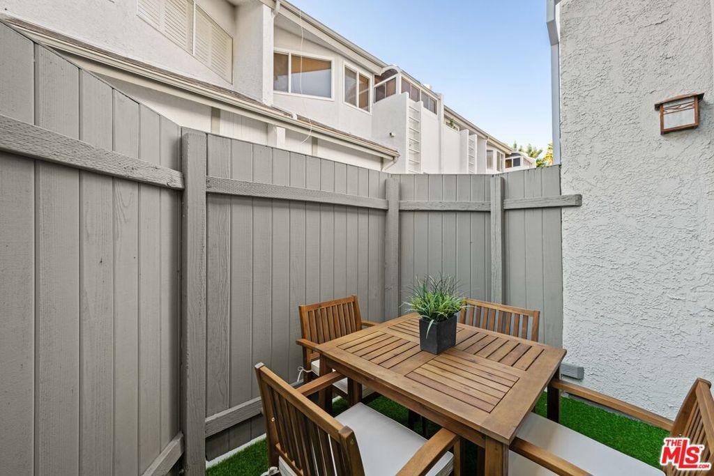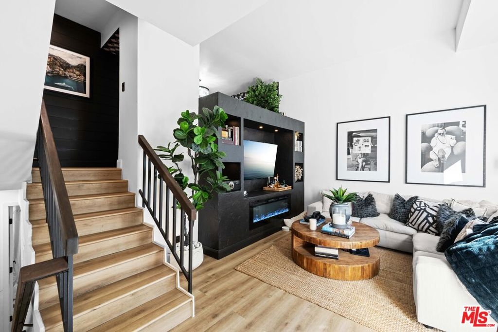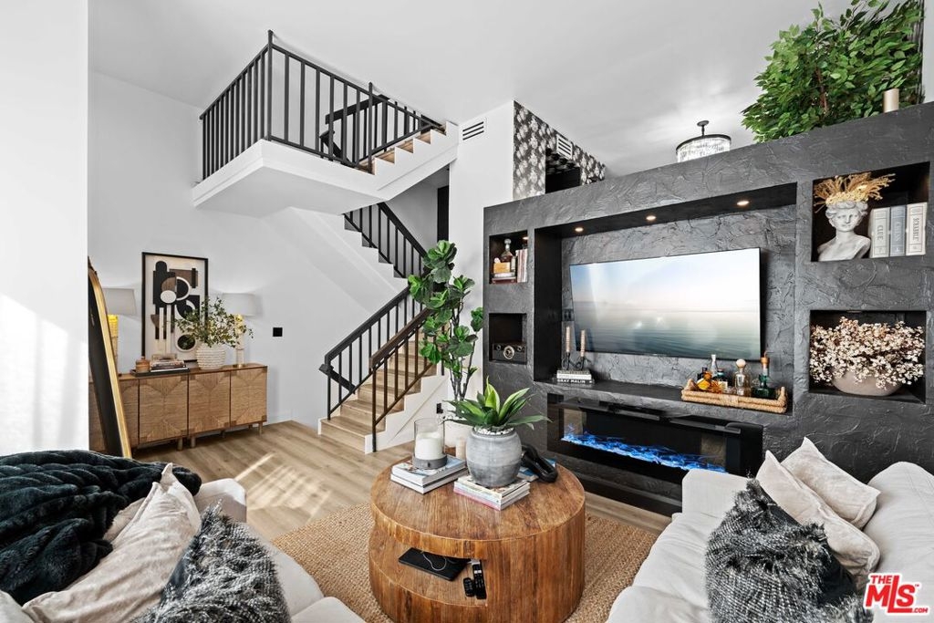 This sleek and beautifully remodeled tri-level townhome, is ideally situated in the heart of Studio City, just a short stroll away from Universal Studios, shopping, and dining. Featuring high ceilings in the living room and primary bedroom, along with vinyl flooring throughout. The living room invites you to relax with its cozy electric fireplace and adjacent private patio, perfect for unwinding after a long day. The modern kitchen includes black tile backsplash, black cabinetry, and stainless steel appliances, seamlessly blending style and functionality. Entertain your guest in the dining area, complete with a built-in bar. Upstairs, the airy primary ensuite bedroom offers a tranquil retreat with a jetted tub, walk-in closet, and access to a private balcony with a custom bench - an ideal spot to share quality moments with loved ones. The convenience of an in-unit washer and dryer is also located on this level. The lower level features a versatile bedroom and 3/4 bathroom, perfect for use as a guest room or home office, providing privacy and separation from the main living areas. This townhome includes two assigned parking spaces and additional storage in the parking area, with ample guest parking available within the community.