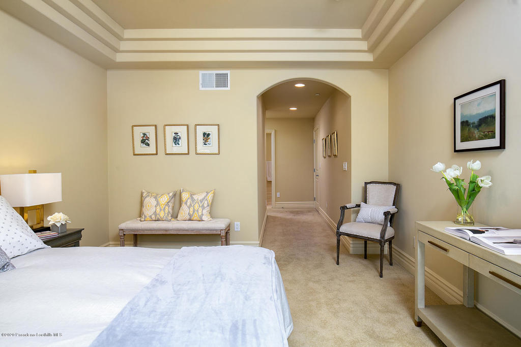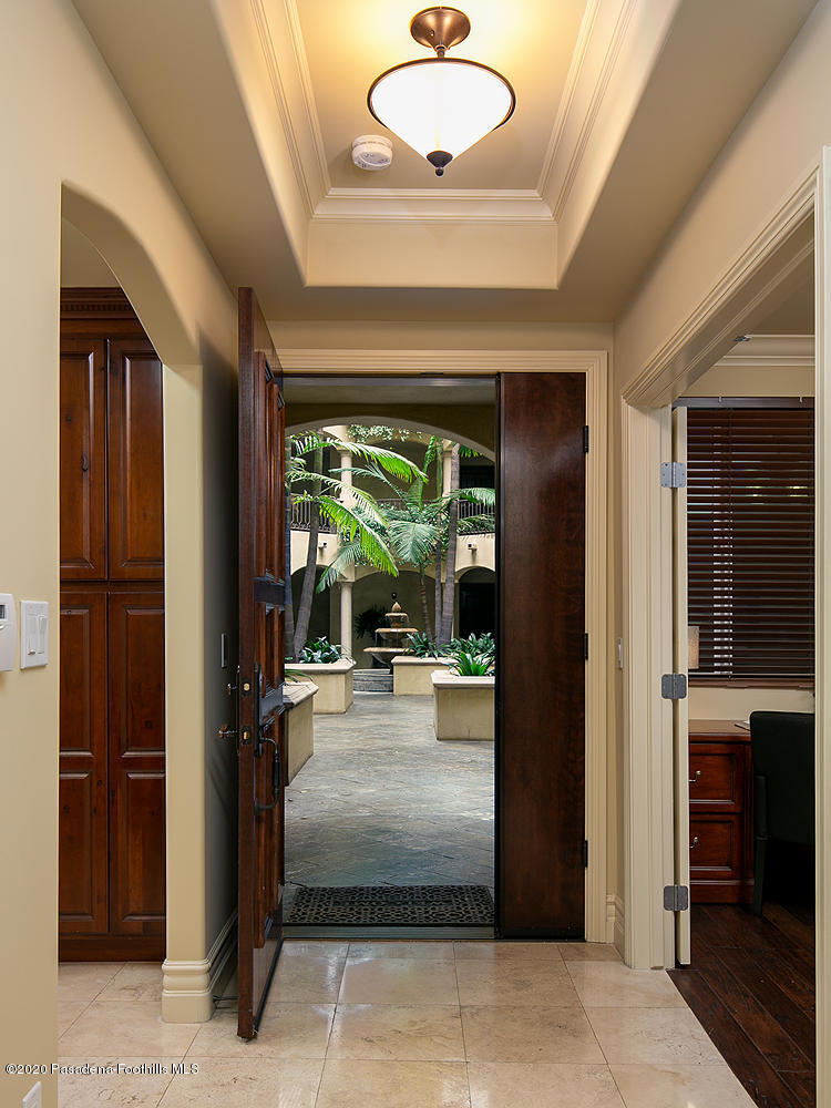 This refined 3 bedroom, 3 bath condominium is spacious and sophisticated . Located close to the shops and restaurants of Ventura Boulevard yet on a quiet street it provides the perfect blend of the fun and trendy with a quiet and peaceful street. Located on the main level of the gated building, you enter through a lush open air courtyard. Tall ceilings with triple tray detailing and stone tile flooring make a striking entrance to the unit. Just off to the left as you enter, one of the bedrooms is currently used as a library/office with custom cabinetry, desk and shelving. The well appointed kitchen has rich wood cabinets, granite counters and stainless appliances. The large living/dining room has gleaming wood flooring, gas fireplace and french doors leading the the patio. Tall baseboards, triple tray ceiling detailing and recessed lighting create an atmosphere of style and quality. The split floor plan has the master suite on one side of the unit, creating its own oasis with a sumptuous master bath, walk-in-closet and french doors leading to the patio. On the opposite side of the unit there is a third bedroom, full bath, multiple closets and stackable laundry as well as a powder room.