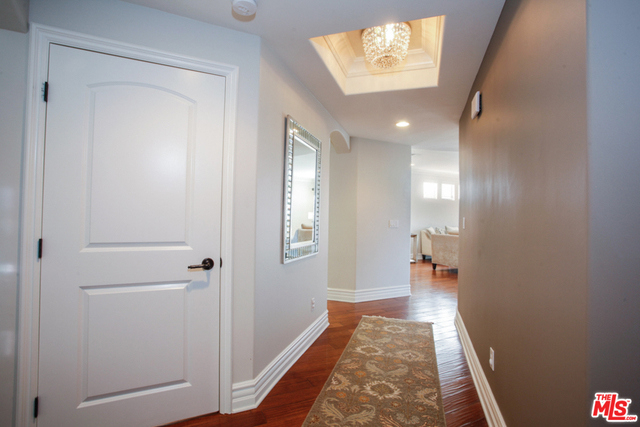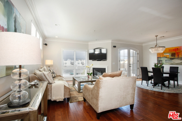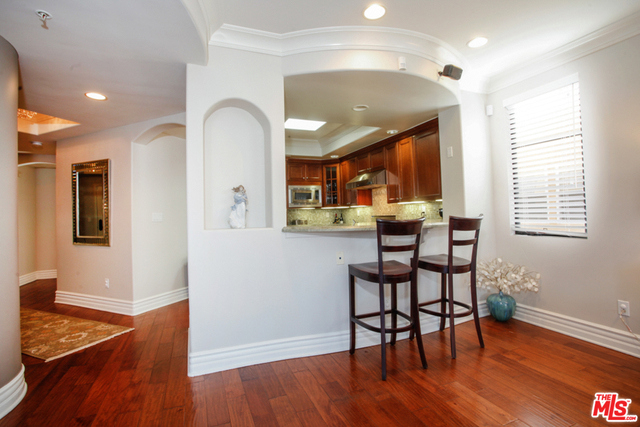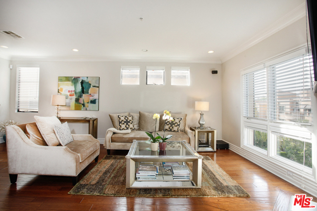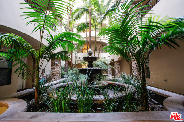 Elegant corner front-facing unit on one of the area's best tree lined streets. Close to Joans on Third, CBS Studios, Trader Joes, Dupars and the current trendiest cafes and shops. Impressive secure entrance with palms and courtyard fountain evoke a European style villa. Excellent floor plan with hand-hewn style wood floors throughout the public spaces. Formal entry and hallway with coffered ceilings lead to an oversized gourmet kitchen with granite counters, SS appliances and breakfast bar. Bright open living space with fireplace, surround sound and dining area with french doors opening to a generous terrace. Northern veiws look to the San Gabriel and Verdugo Mountains. Large Master bedroom featuring high ceilings, walk in-closet and large en-suite bathroom with double sinks, soaking tub and shower. The front third bedroom doubles as an office or den. Guest bedroom with custom shades and matching light fixture share another full bath, Laundry in unit.