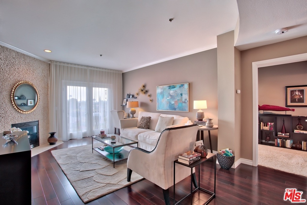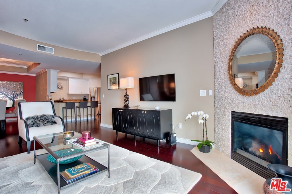 SUPERIOR LOCATION. BEAUTIFUL TOP FLOOR CORNER CONDO FACING THE MOUNTAINS. GORGEOUS VIEWS!!! QUIET!!! BACK OF THE BUILDING. Sit on your balcony & enjoy the sunset. This one level open floor plan features a large en suite master bedroom w/ a HUGE walk in closet & bathroom w/ 2 vanity sinks, large tub & separate walk in shower. The living room has a warming fireplace. The kitchen w/breakfast bar has stainless appliances, granite counter top & is open to the full sit down dining room w/sexy chandelier. Rich hardwood floors. Stackable LG full size Washer/Dryer. Each bedroom has its own bath and is located on separate sides of the main living area, creating complete privacy. Lovely powder room for guests. Excellent storage. Guest parking is available under the secure parking garage. 2 tandem assigned parking spaces. Community gym & secure entry with elevator. Live in or use as rental income property. Studio close & a wonderful area for walking, close to hiking trails and best schools.