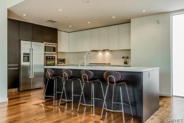 Clean modern living in the heart of Studio City, designed by award winning architect Zoltan Pali. Experience mountain, tree top views and take in the gorgeous sunrise every morning from this stunning front facing corner penthouse, designed with floor to ceiling windows and an artistic flair. Featuring an open floor plan with high end finishes that include wide plank walnut floors, Ceasarstone countertops, Italian cabinetry, porcelain floors, high ceilings, professional lighting design and commercial grade sliding doors that open to a generous sized very private balcony. This unit is unique in that you enter from outside near a private patio. The gourmet kitchen offers stainless appliances and a large island with counter seating. Boasting 2 generous sized bedrooms and 2 luxury bathrooms with skylights, this immaculate light and bright home is located in the renowned Woodbridge 12 building. The unit comes with 2 car secured parking spaces and a large secure storage unit. Just blocks from 2 parks and the new Sportsmen’s Lodge development with Erewhon and Equinox, this home is a turn key gem.