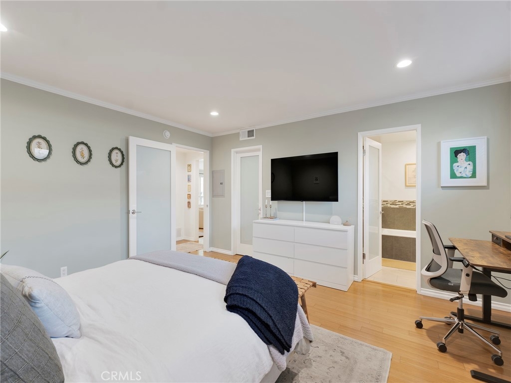 Experience wonderful Studio City living in this attractive condo, where modern design and effortless convenience converge. This two-bedroom, two-bath condominium offers a light-filled open floor plan with rich wood flooring, and an ambiance of understated elegance. The kitchen, outfitted with stainless steel appliances and polished granite countertops, flows seamlessly into the spacious living and dining areas—perfect for both entertaining and quiet evenings at home. The primary suite is a private sanctuary, featuring a custom walk-in closet and a spa-inspired bath complete with a glass-enclosed shower and a deep soaking tub. Curated details such as recessed lighting, plantation shutters, and a discreet in-unit washer and dryer enhance everyday comfort. Step outside to your expansive, enclosed patio—a serene retreat ideal for al fresco dining or morning reflection. Situated on a tranquil, tree-lined street with gated access, this condo offers both privacy and peace of mind. Enjoy low HOA fees while living moments from Ventura Boulevard’s acclaimed dining, boutique shopping, and the newly reimagined Sportsmen’s Lodge social center. With easy access to studios and major freeways, this residence embodies the sophistication and convenience of modern Studio City living. Features new HVAC, new windows, new water heater and a new updated electrical panel.