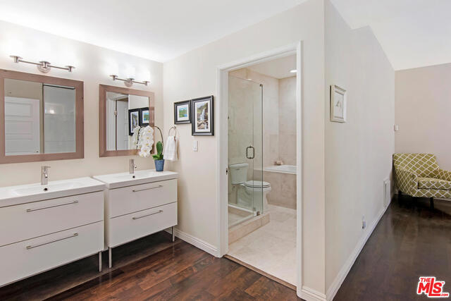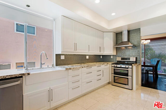 Exquisitely remodeled 2 bedroom + 2.5 bath single level condominium with tons of natural light. Located in the heart of Studio City on a serene tree lined street and a few steps from the Riverwalk for dog walking, strolling and jogging. Enjoy the tranquil home life with the convenience of walking to the Blvd and the great restaurants and shopping. Wide plank hard wood floors compliment a wonderful floor plan for both entertaining and family life. The gourmet kitchen includes granite counters, stainless steel appliances, custom cabinetry w/ custom pantry pull out doors and luxurious marble kitchen floors. Escape to the master suite w/ luxurious spa tub and shower, double vanity, walk in closet and secondary wall-attached closet. Other highlights include an open dining area leading to patio overlooking the courtyard, living room with fireplace, recessed lighting, laundry in unit, and two individual parking spaces. The complex is private and very well maintained with an open courtyard,