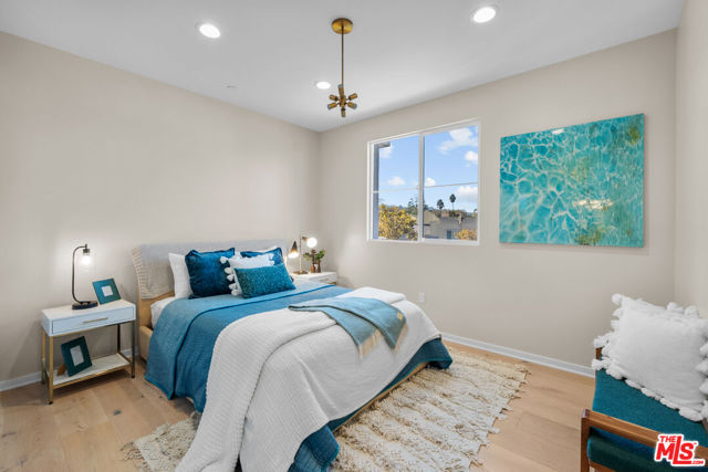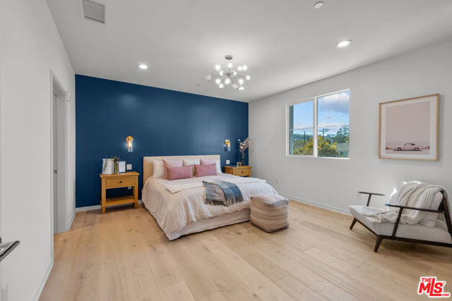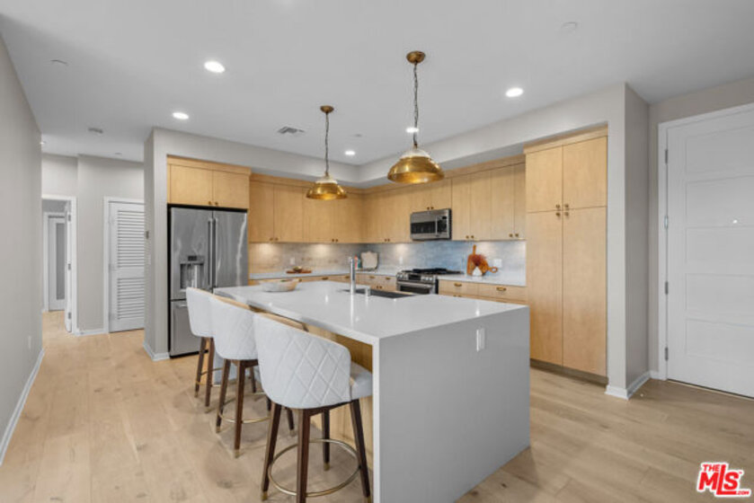 Stunning luxury front-facing Penthouse 401 in Studio City offers modern sophistication and elegance. Built in 2017, it features 9 ft. ceilings and wide-plank oak floors. The spacious living and dining areas open to a private balcony with lush treetop and mountain views. The sleek kitchen includes GE Caf appliances and Caesarstone countertops. The residence features two master bedrooms with luxurious en-suites; the primary retreat offers a fabulous walk-in closet, double vanity, freestanding tub, and spa-like shower. A versatile third bedroom/office offers ample storage. Enjoy in-unit laundry and side-by-side parking in a gated garage. Building amenities include a security system, fitness center, meeting room, sundeck with BBQs, and a bike room. Located in the Carpenter School District and just a block from Ventura Place's popular spots like Joan's on Third.
