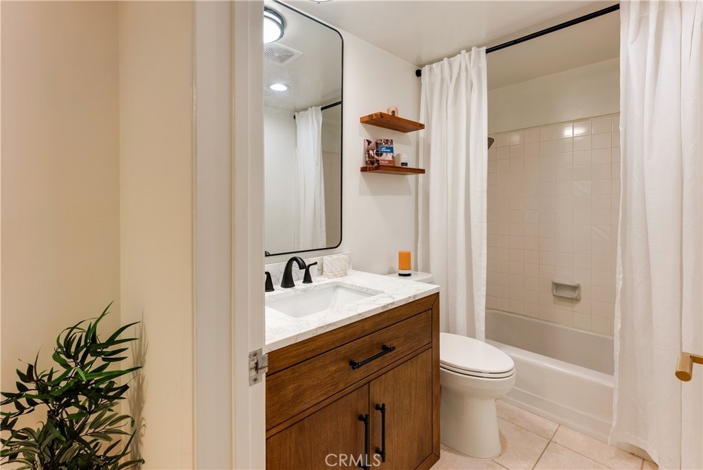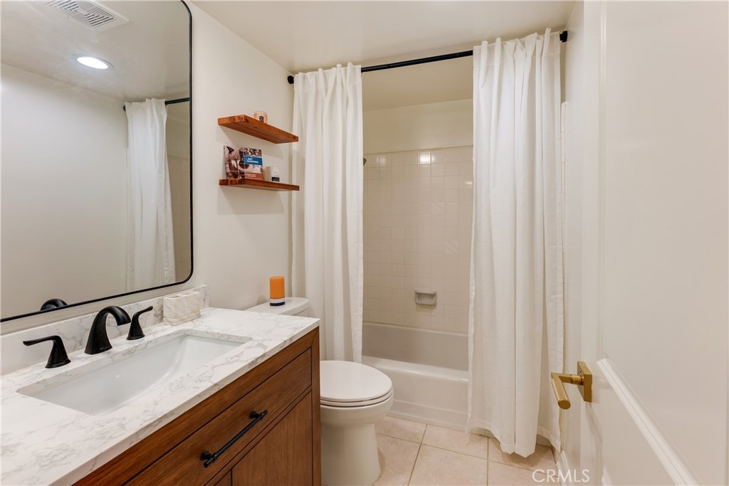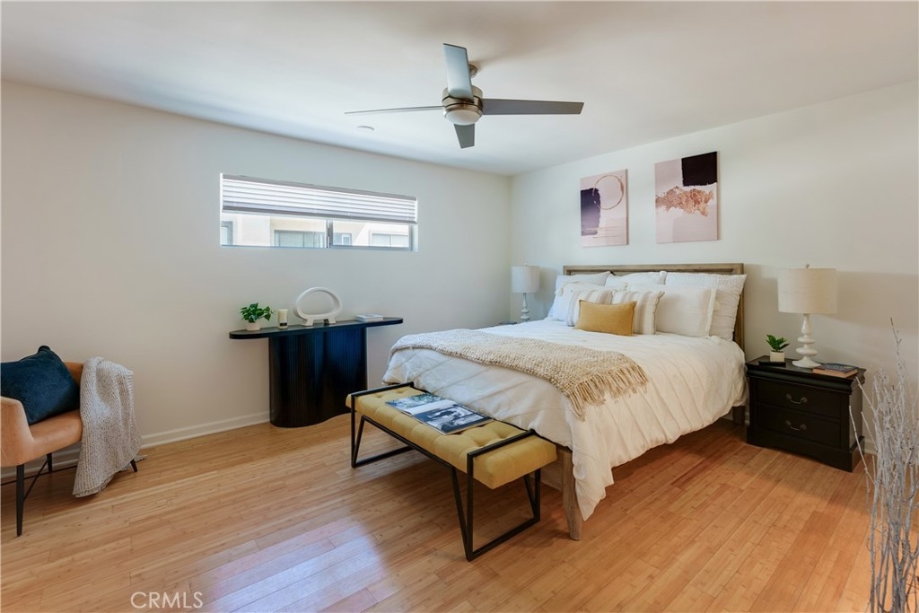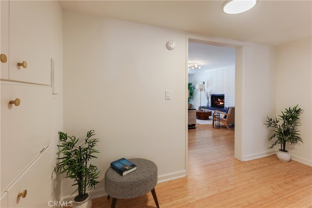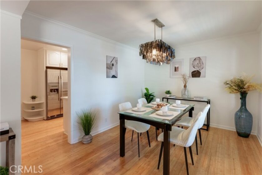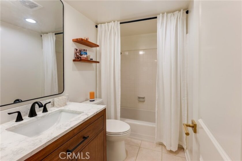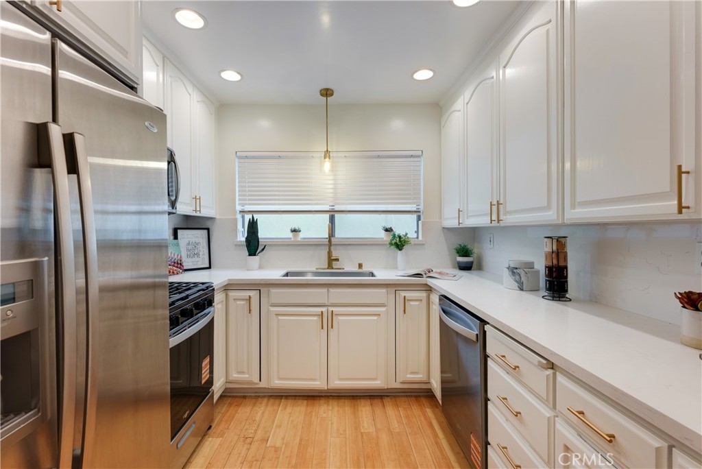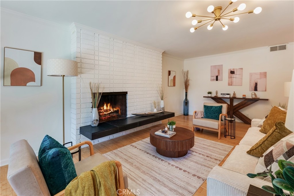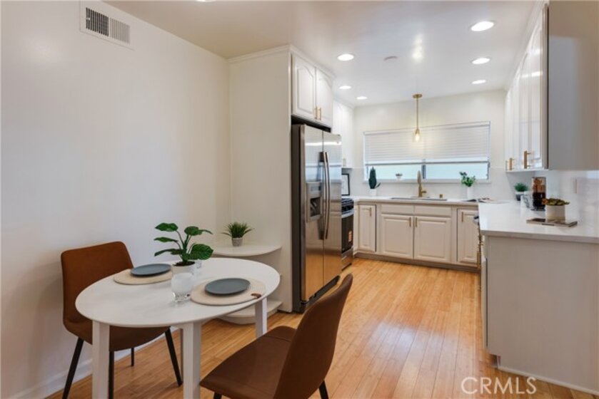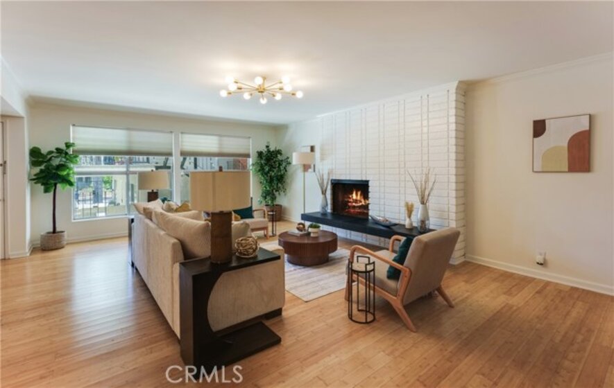 Step into this sleek mid-century modern condo, which offers the perfect blend of timeless design and contemporary upgrades. This spacious 2-bedroom, 2-bath residence features generously sized rooms and an open floor plan that creates a bright, airy feel throughout. The formal living room is anchored by a cozy fireplace, making it an inviting space to relax or entertain. The eat-in kitchen is both stylish and functional, showcasing quartz countertops and stainless steel appliances, including a brand-new stove and dishwasher. Bamboo flooring runs throughout the home, complemented by updated lighting that enhances the clean, modern aesthetic. Both bedrooms are well-proportioned, offering comfort and privacy. The large primary suite boasts abundant closet space and an ensuite featuring a remodeled bathroom with additional linen storage. The hall bathroom has been thoughtfully updated with a new vanity, countertop, floating shelves, and a tub/shower combination for added convenience. Located in an intimate 6-unit building on a quiet, residential street, this condo offers a shared two-car garage and a designated storage area. A perfect combination of classic mid-century charm and modern living. --