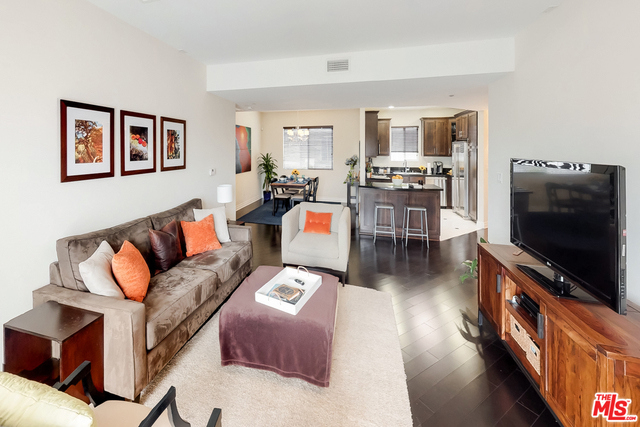 This quiet top-floor unit at the Lumiere Condominiums has rich espresso hardwood floors and a large open floor plan that features a fireplace and a spacious balcony with east facing mountain views. The gourmet kitchen has granite counters, stainless steel appliances, center island, adjacent to a formal dining area. The large master suite offers a massive walk-in closet, another large closet, balcony access, and master bath with dual vanities, marble counter, soaking tub, and glass shower. The well-appointed guest suite includes two large closets, and en-suite bathroom. The unit has a new top-rated HVAC for central air conditioning, a washer/dryer and two non-tandem parking spaces in the subterranean garage. Lumiere's amenities include a furnished courtyard, fountain, outdoor fireplace, Zen garden, and fitness center. It is blocks from Beeman Park, Weddington Golf & Tennis, and Studio City's most popular schools, restaurants, and shops, with easy access to the 101 and 134 freeways.