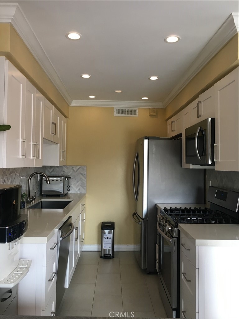 Wonderful opportunity to own in a prime Studio City location, short distance from the "Silver Triangle". Ultra private, remodeled 1 bedroom, 1 bathroom corner unit in one of the most desirable neighborhoods in Studio City. Just South of the 101, blocks from Beeman Park. Remodeled kitchen with custom cabinets, Caesarstone counters, marble back splash, Samsung stainless appliances and newer flooring. Totally upgraded with newer windows, smooth ceilings, recessed LED lighting, newer window treatments, private washer & dryer and updated bathroom. Open floor plan with lots of natural light. Living room has modern slate gas fireplace & built in shelving, distressed hardwood floors. Bedroom has enormous wall to wall mirrored closets with custom shelving, lots of storage. Best location in the complex - end unit, private patio & private entrance in rear of building. Close to pool, parking garage, and guest parking. Super close to Whole Foods, Ventura Boulevard shopping, night life and some of the best restaurants in Los Angeles. LOW HOA dues. Won't last!